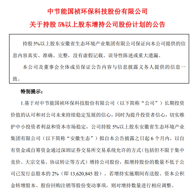 10月14日,节能国祯(300388.SZ)发布公告,公司股东安徽省生态环境产业集团有限公司(简称“安徽生态”)拟以自有资金或自筹资金通过深圳证券交易所交易系统允许的方式(包括但不限于集中竞价、大宗交易、协议转让等方式)增持公司股份,拟增持股份的数量不低于公司已发行总股本的2%(即1362.08万股)。