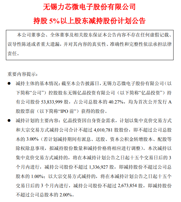 10月24日,力芯微(688601.SH)发布公告,亿晶投资因自身资金需求,计划以集中竞价交易方式和大宗交易方式减持公司合计不超过401.08万股股份,即不超过公司总股本的3%。