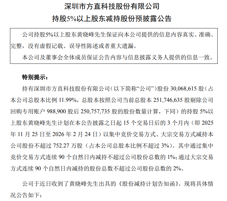 11月3日,方直科技(300235.SZ)公告,公司持股5%以上股东黄晓峰先生计划在2025年11月25日至2026年2月24日以集中竞价交易方式、大宗交易方式减持公司股份不超过752.27万股(占公司总股本比例不超过3%)。