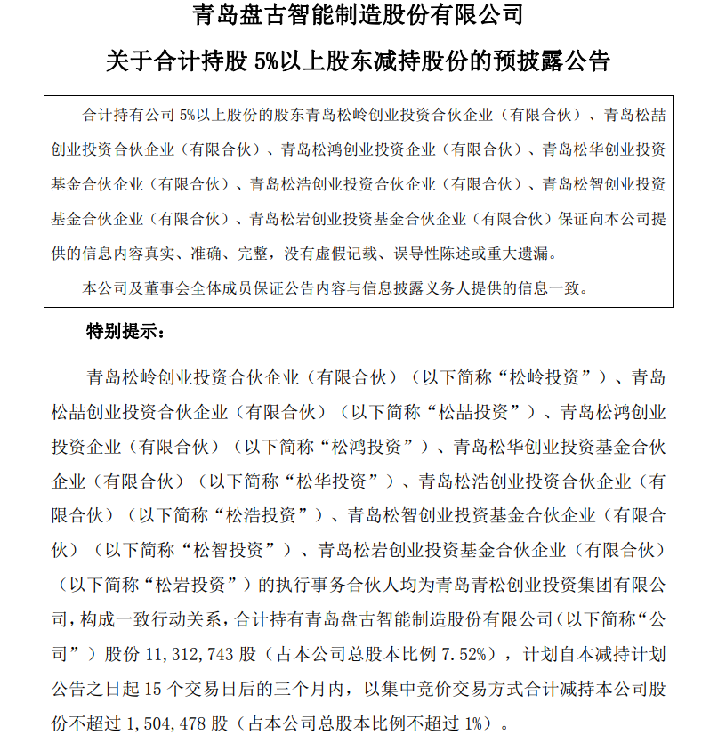 11月13日,盘古智能(301456.SZ)发布公告,公司于近日收到合计持有公司5%以上股份的股东松岭投资、松喆投资、松鸿投资、松华投资、松浩投资、松智投资、松岩投资出具的《股份减持计划告知函》,计划自减持计划公告之日起15个交易日后的三个月内,以集中竞价交易方式合计减持公司股份不超过150.45万股(占公司总股本比例不超过1%)。
