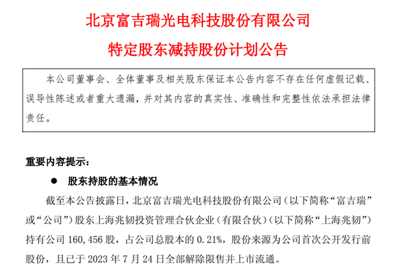 11月21日,富吉瑞(688272.SH)发布公告,上海兆韧拟通过竞价交易、大宗交易方式减持股份数量合计不超过16.05万股,即不超过公司总股本的0.21%。