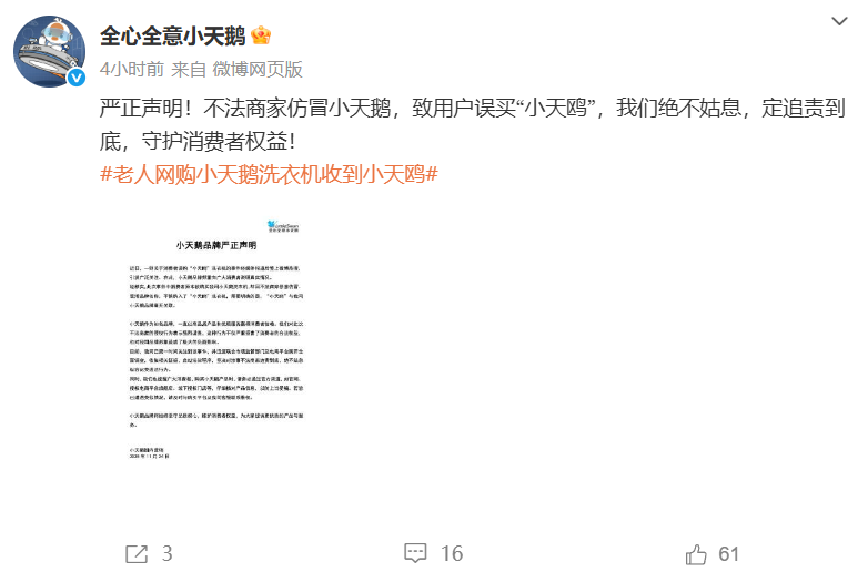 11月24日,小天鹅在官方微博发布了一则严正声明,称市场上出现不法商家仿冒其品牌的行为,导致部分消费者误购了名为“小天鸥”的产品。声明中指出,此类行为严重侵害了消费者权益与小天鹅的品牌声誉,公司对此表示强烈谴责。