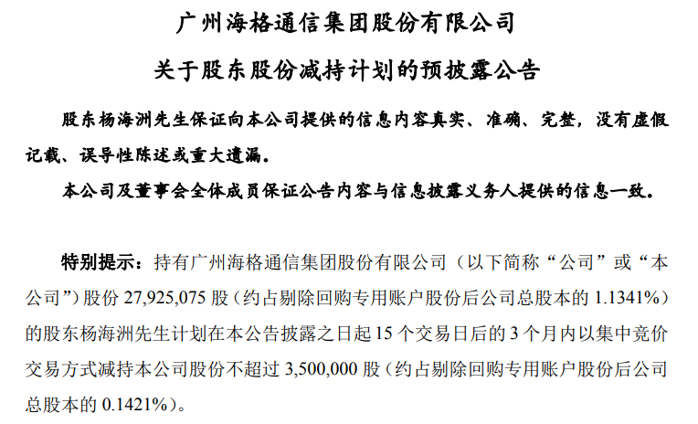 12月8日,海格通信(002465.SZ)发布公告,股东杨海洲先生计划在本公告披露之日起15个交易日后的3个月内以集中竞价交易方式减持本公司股份不超过350万股(约占剔除回购专用账户股份后公司总股本的0.1421%)。