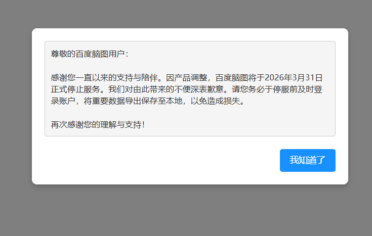 声明:综业网科技发布此内容旨在传播更多信息,不构成投资建议,据此操作,风险自担。转载时需注明出处:综业网科技 » 百度脑图宣布将于2026年3月31日停服,用户需及时备份数据
