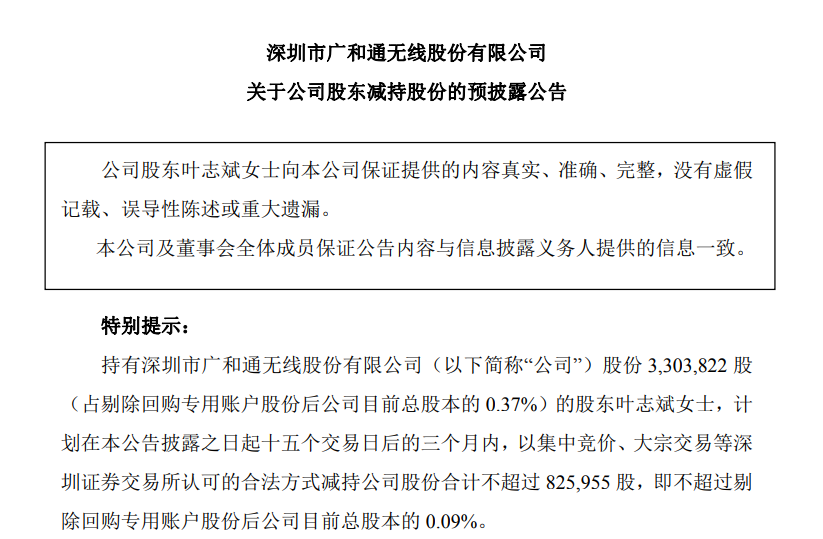 12月17日,广和通发布公告,持有公司股份330.38万股(占剔除回购专用账户股份后公司目前总股本的0.37%)的股东叶志斌,计划在公告披露之日起十五个交易日后的三个月内,以集中竞价、大宗交易等深圳证券交易所认可的合法方式减持公司股份合计不超过82.6万股,即不超过剔除回购专用账户股份后公司目前总股本的0.09%。