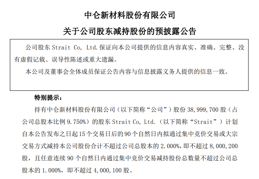 12月17日,中仑新材(301565.SZ)发布公告,持股9.750%的股东Strait Co,Ltd.(简称“Strait”)计划自公告发布之日起15个交易日后的90个自然日内拟通过集中竞价交易或大宗交易方式减持公司股份合计不超过公司总股本的2%,即不超过800.02万股,且任意连续90个自然日内通过集中竞价交易减持股份总数量不超过公司总股本的1%,即不超过400.01万股。
