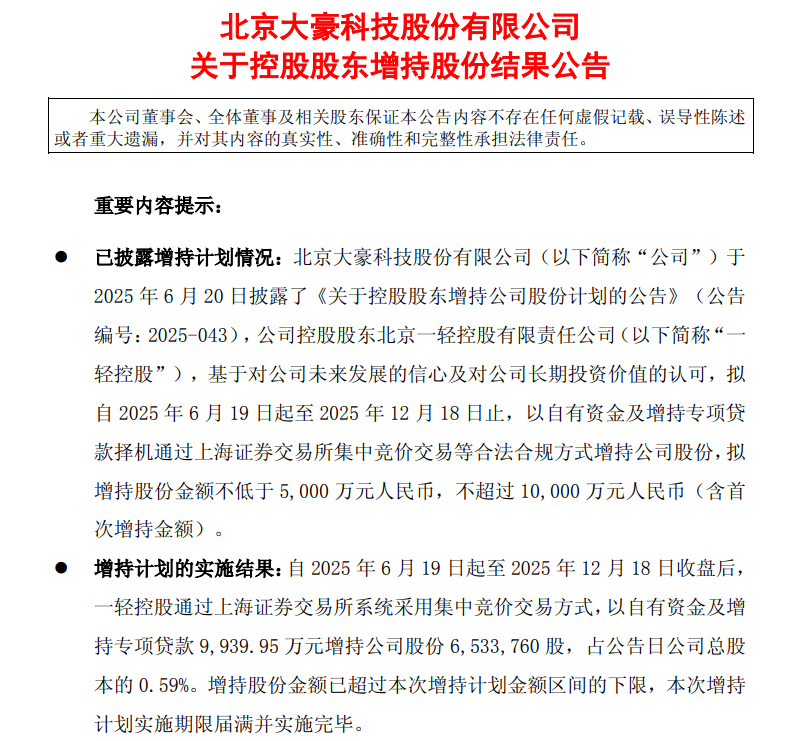 12月19日,大豪科技(603025.SH)发布公告,自2025年6月19日起至2025年12月18日收盘后,公司控股股东一轻控股通过上海证券交易所系统采用集中竞价交易方式,以自有资金及增持专项贷款9939.95万元增持公司股份653.38万股,占公告日公司总股本的0.59%。增持股份金额已超过本次增持计划金额区间的下限,本次增持计划实施期限届满并实施完毕。