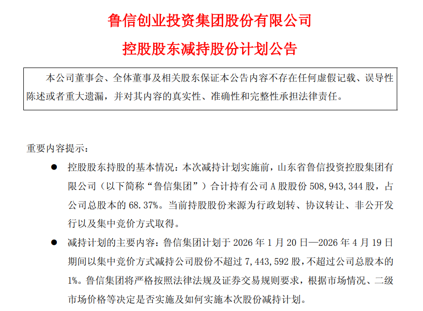 12月24日,鲁信创投(600783.SH)发布公告,公司控股股东鲁信集团计划于2026年1月20日—2026年4月19日期间以集中竞价方式减持公司股份不超过744.36万股,不超过公司总股本的1%。