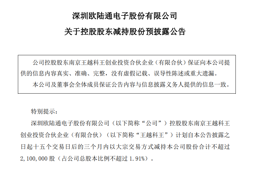 12月29日,欧陆通(300870.SZ)发布公告,公司控股股东南京王越科王创业投资合伙企业(有限合伙)(以下简称“王越科王”)计划自本公告披露之日起十五个交易日后的三个月内以大宗交易方式减持本公司股份合计不超210万股(占公司总股本比例不超过1.91%)。