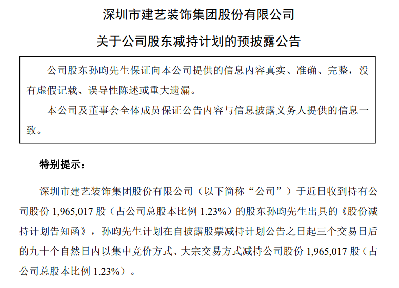 1月8日,*ST建艺(002789.SZ)发布公告,公司于近日收到持有公司股份196.5万股(占公司总股本比例1.23%)的股东孙昀先生出具的《股份减持计划告知函》,孙昀先生计划在自披露股票减持计划公告之日起三个交易日后的九十个自然日内以集中竞价方式、大宗交易方式减持公司股份196.5万股(占公司总股本比例1.23%)。