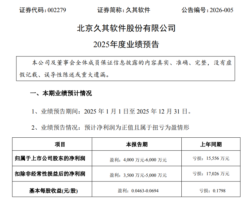 1月20日,久其软件(002279.SZ)披露2025年度业绩预告,公司预计归属于上市公司股东的净利润4000万元-6000万元,扭亏为盈;扣除非经常性损益后的净利润3500万元-5000万元。