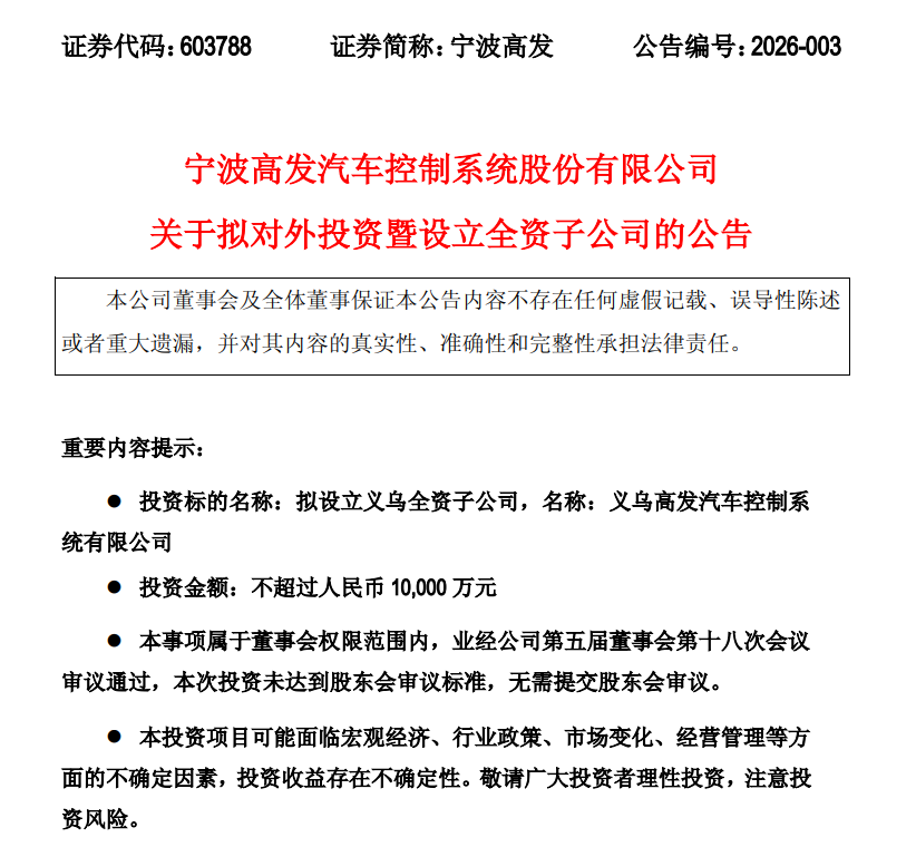 2月10日,宁波高发(603788.SH)发布公告,公司为深耕国内市场,根据客户需求及公司业务发展需要,拟以自有资金投资设立义乌全资子公司,名称:义乌高发汽车控制系统有限公司。该项目计划投资总额不超过1亿元,包括但不限于固定资产投资、研发投入和营运资金投入。