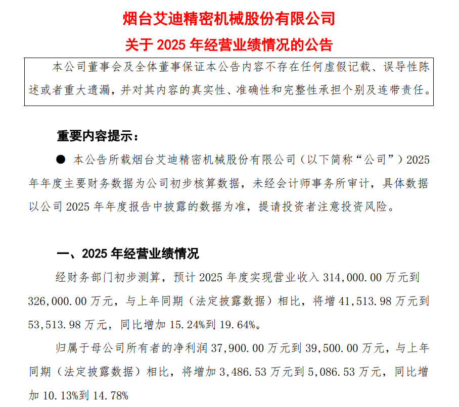 2月10日,艾迪精密(603638.SH)发布公告,公司预计2025年度实现营业收入31.4亿元到32.6亿元,同比增加15.24%到19.64%。归属于母公司所有者的净利润3.79亿元到3.95亿元,同比增加10.13%到14.78%。