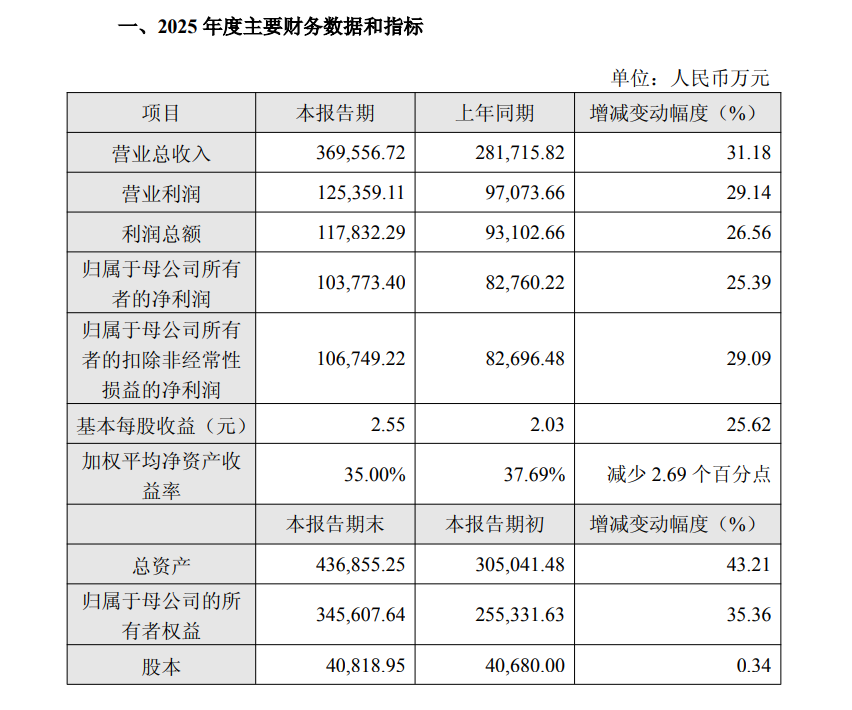2月10日,特宝生物(688278.SH)披露2025年度业绩快报,2025年度实现营业总收入36.96亿元,同比增长31.18%;归属于母公司所有者的净利润10.38亿元,同比增长25.39%。