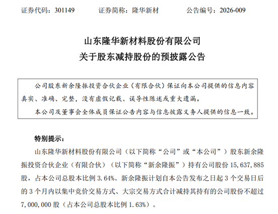 2月25日,隆华新材(301149.SZ)公告,公司股东新余隆振投资合伙企业(有限合伙)(简称“新余隆振”)计划自本公告发布之日起3个交易日后的3个月内以集中竞价交易方式、大宗交易方式合计减持其持有的公司股份不超过700万股(占公司总股本比例1.63%)。