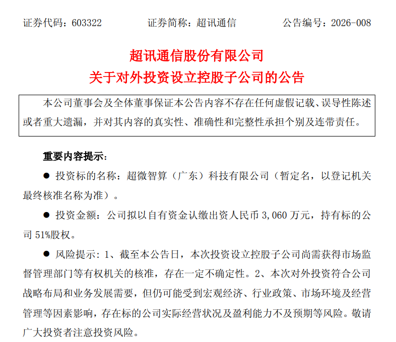 3月12日,超讯通信公告,公司拟与广东微云科技股份有限公司(简称“微云科技”)共同投资设立超微智算(广东)科技有限公司(简称“超微智算”)。超微智算拟定注册资本为6000万元,其中公司拟以自有资金出资3060万元,持有超微智算51%股权。