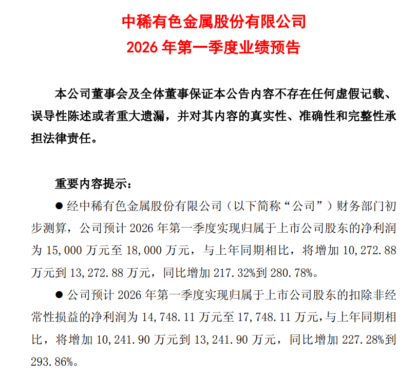 4月10日,中稀有色(600259.SH)发布公告,公司预计2026年第一季度实现归属于上市公司股东的净利润为1.5亿元至1.8亿元,同比增加217.32%到280.78%。